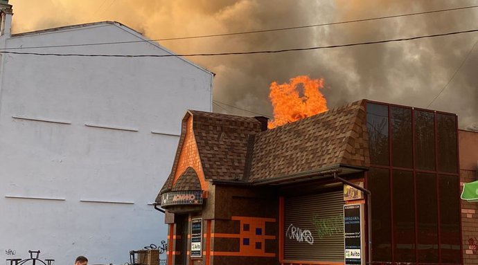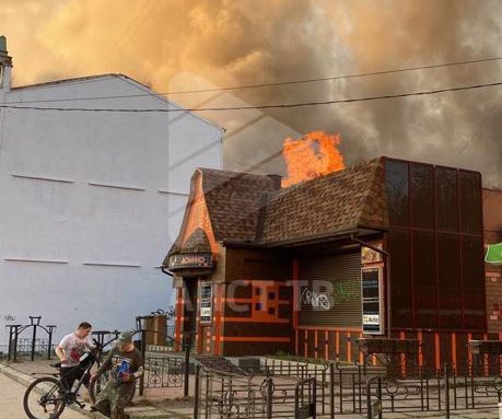Пожар на улице Ленина. Очевидцы сообщают, что горит деревянное строение за зданием бывшей пиццерии. Огонь уже перешёл на крышу соседнего здания.